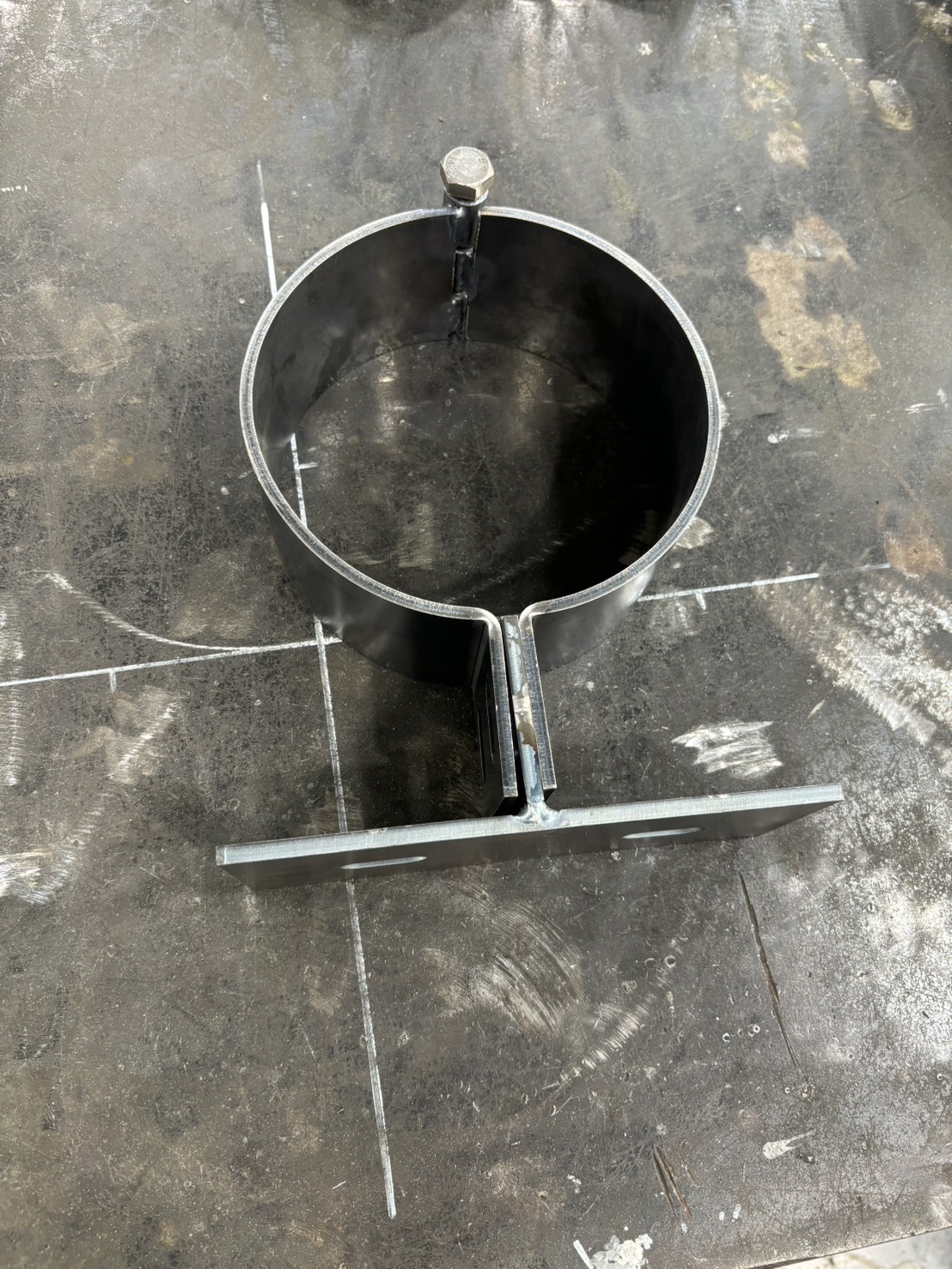 設備に取り付けるための金属製蝶番をワンオフで製作しました。丸パイプ状の部材を組み合わせた構造で、開閉動作や固定が行えるよう、必要な形状に加工しています。ベースとなるフラットプレートに溶接で一体化しており、取付けやすい仕様です。