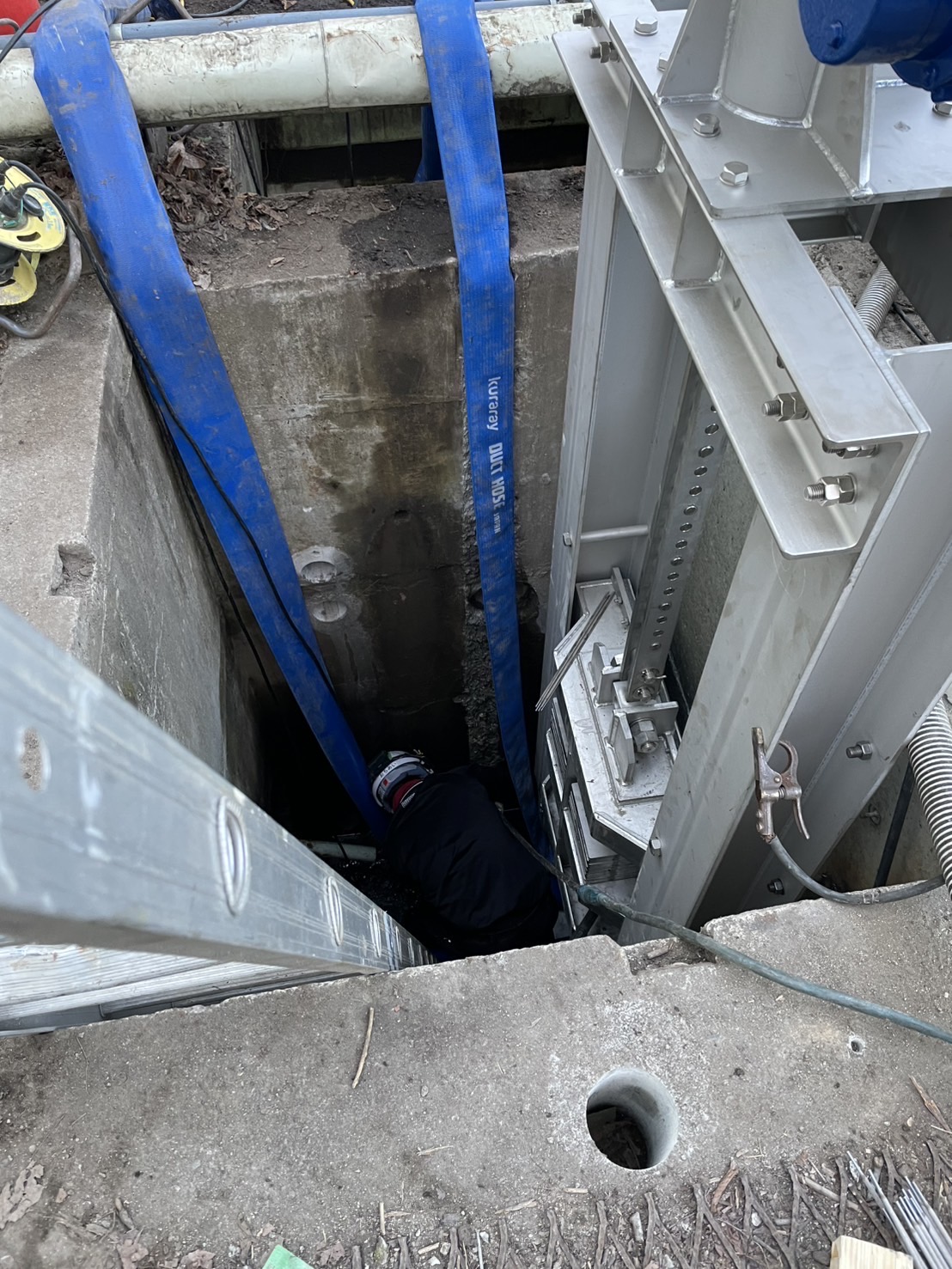 水路に設置する水門設備の取付作業を行いました。限られたスペースでの作業となるため、周囲の構造物や既設配管に干渉しないよう、慎重に位置合わせを行いながら作業を進めています。現場では梯子を使用してピット内部に入り、ボルト締付や固定部の調整を丁寧に実施しました。